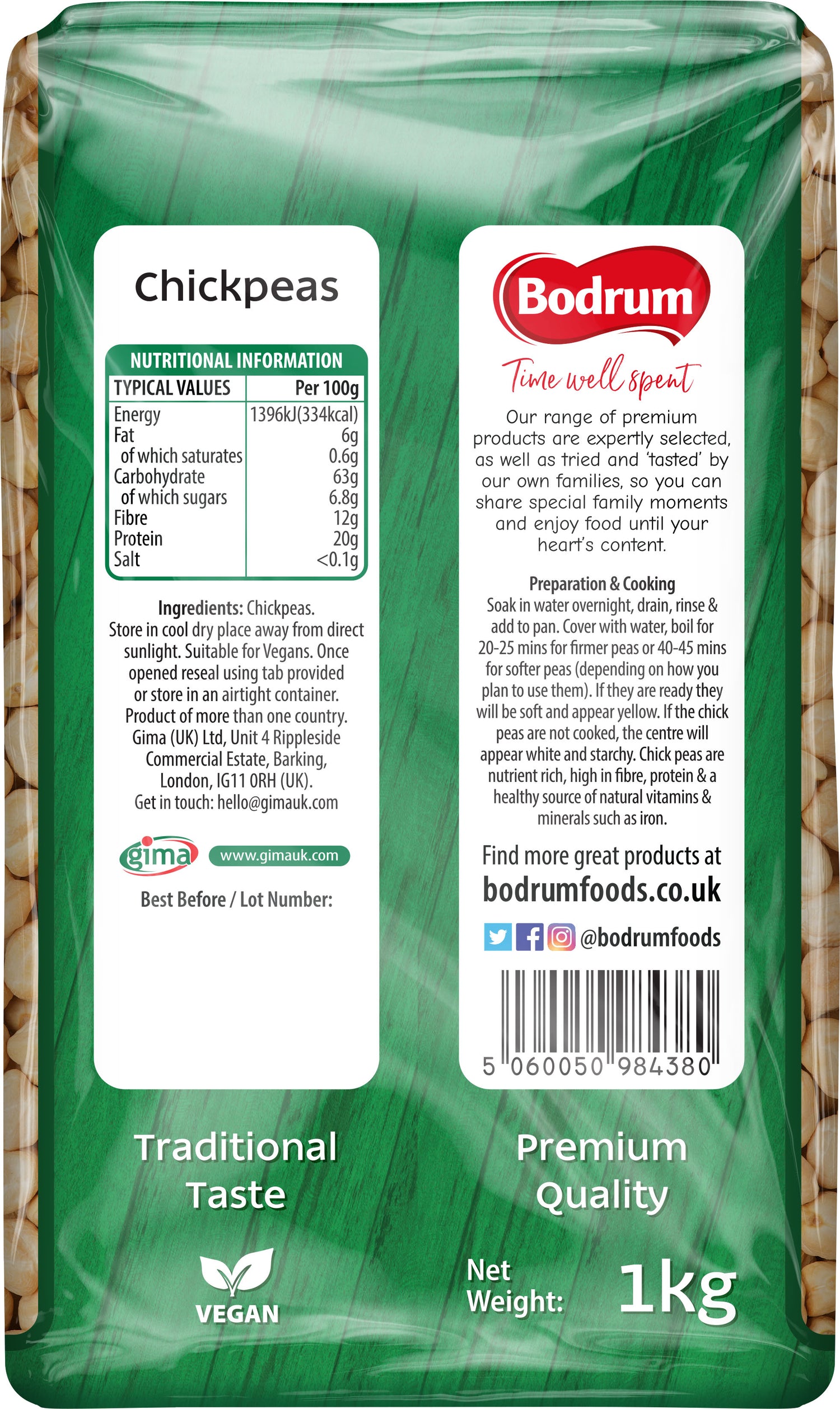 Bodrum Chickpeas are dried legumes, offering a creamy, tender texture and subtle nutty flavour. Ideal for a range of dishes, homemade hummus, hearty stews, vibrant salads, falafel, or spiced curries, these chickpeas bring wholesome nutrition and versatility to your kitchen. Packed with plant-based protein, and fiber, they’re a nutritious staple. Simply soak overnight and simmer until soft, or use a pressure cooker for a quicker cook time.
